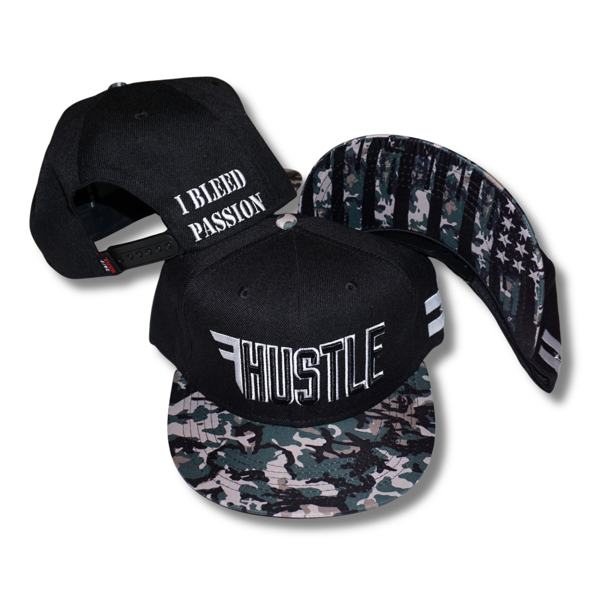 Woven label near the strap that reads "24/7 HUSTLE" and "365" on the inner part of the tag
